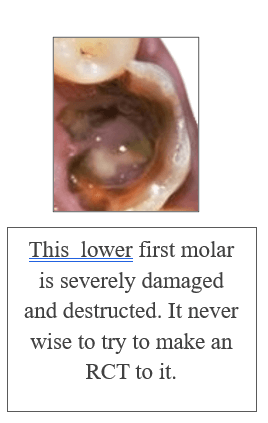 Performing RCT on a non-restorable tooth delays extraction, causes unneeded cost, discomfort, and may even worsen the surrounding bone and soft tissue status so harming the patient.