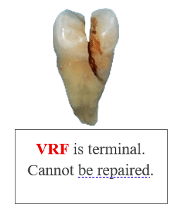 A vertical root fracture is a longitudinal crack that extends from the root canal outward toward the periodontium and it cannot be repaired or sealed.