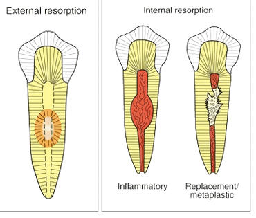 Internal resorption: resorption begins within the pulp chamber or root canal system, typically due to chronic inflammation of the pulp. It leads to uniform widening inside the canal space.